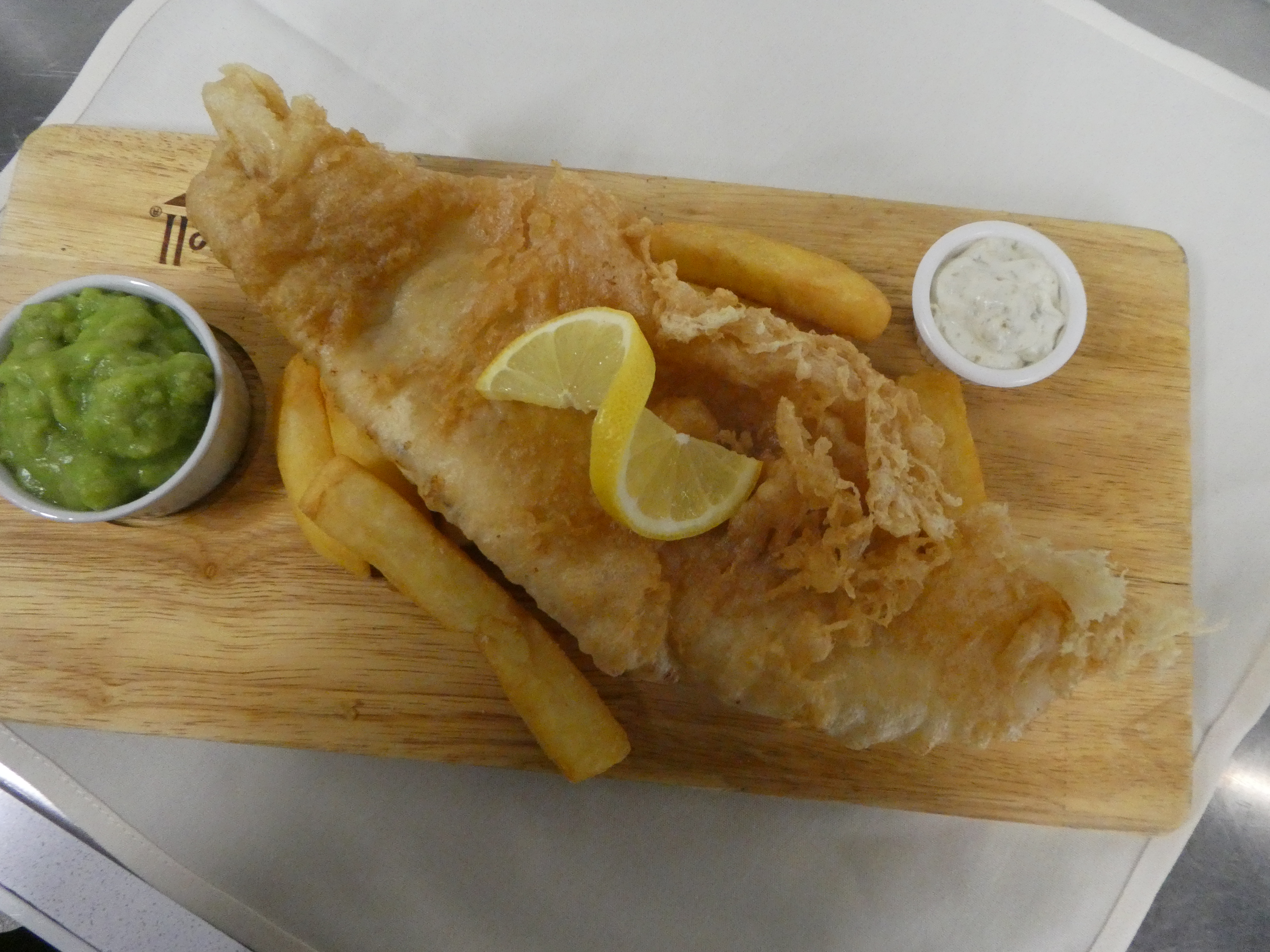 Fish and Chips, haddock served with mushy peas, homemade tartar sauce and lemon wedge Large £19.95 Small £14.95
