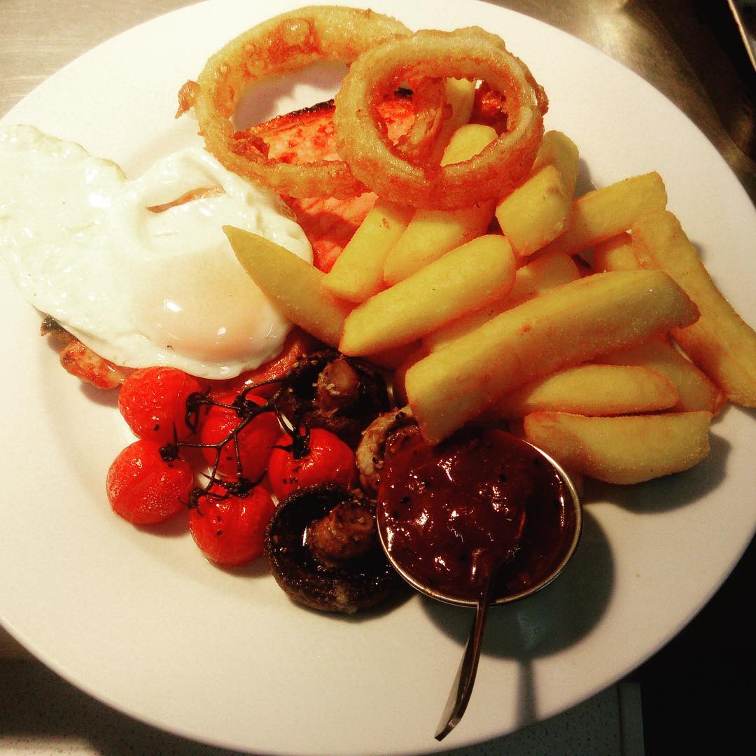 Locally Produced Gammon Steak, served with proper chips, a fried hen’s egg, grilled tomato and mushroom, beer battered onion rings, and chutney £21.95